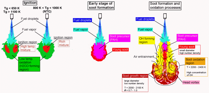 (Ref.: Kosaka, H., Aizawa, T. and Kamimoto, T., “Two-dimensional imaging of ignition and soot formation processes in a diesel flame,” International Journal of Engine Research 6(1), 21-42, 2005)